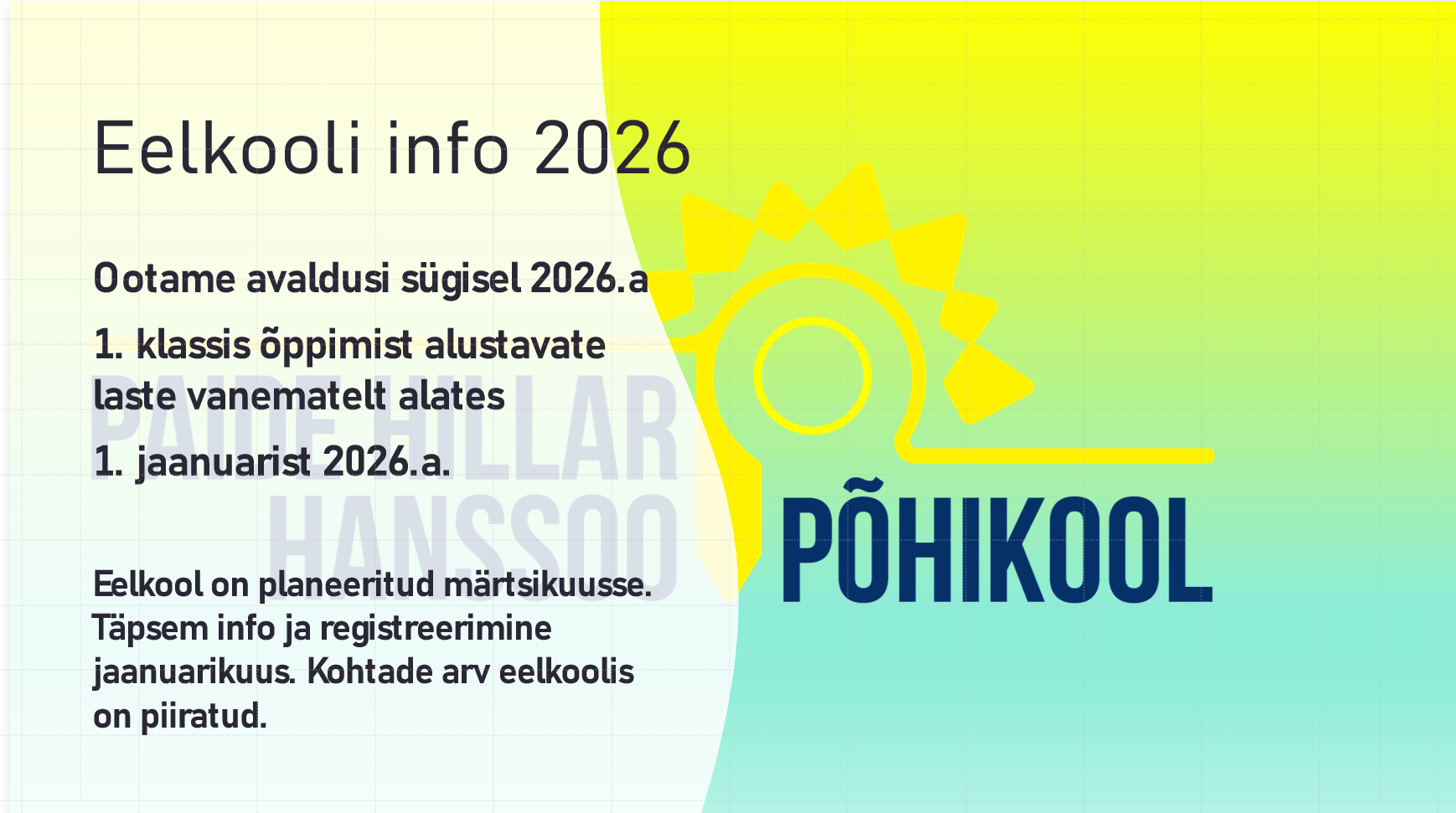 Avaldusi sügisel 2026.a 1. klassis õppimist alustavate laste vanematelt ootame alates 1. jaanuarist 2026.