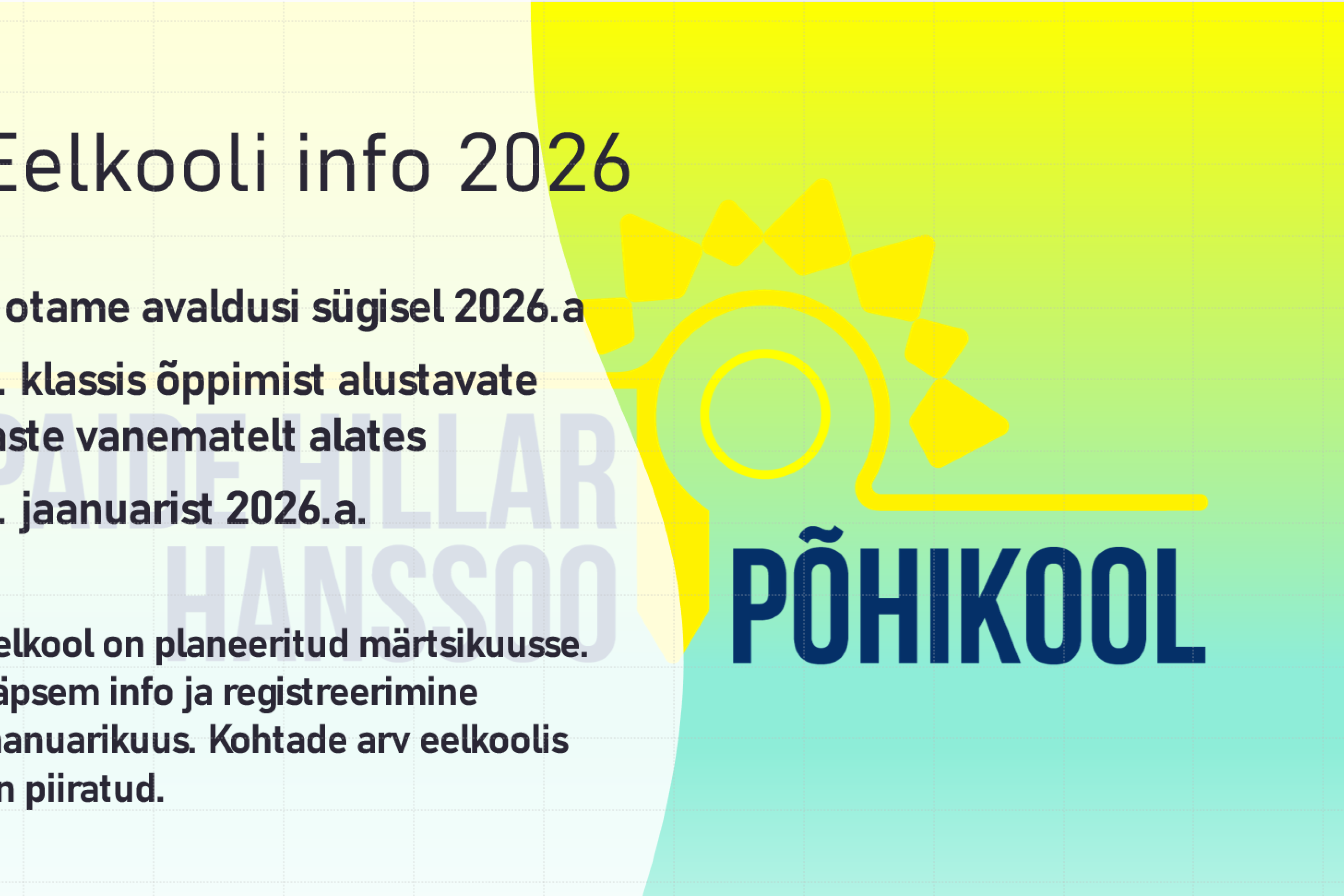 Avaldusi sügisel 2026.a 1. klassis õppimist alustavate laste vanematelt ootame alates 1. jaanuarist 2026.