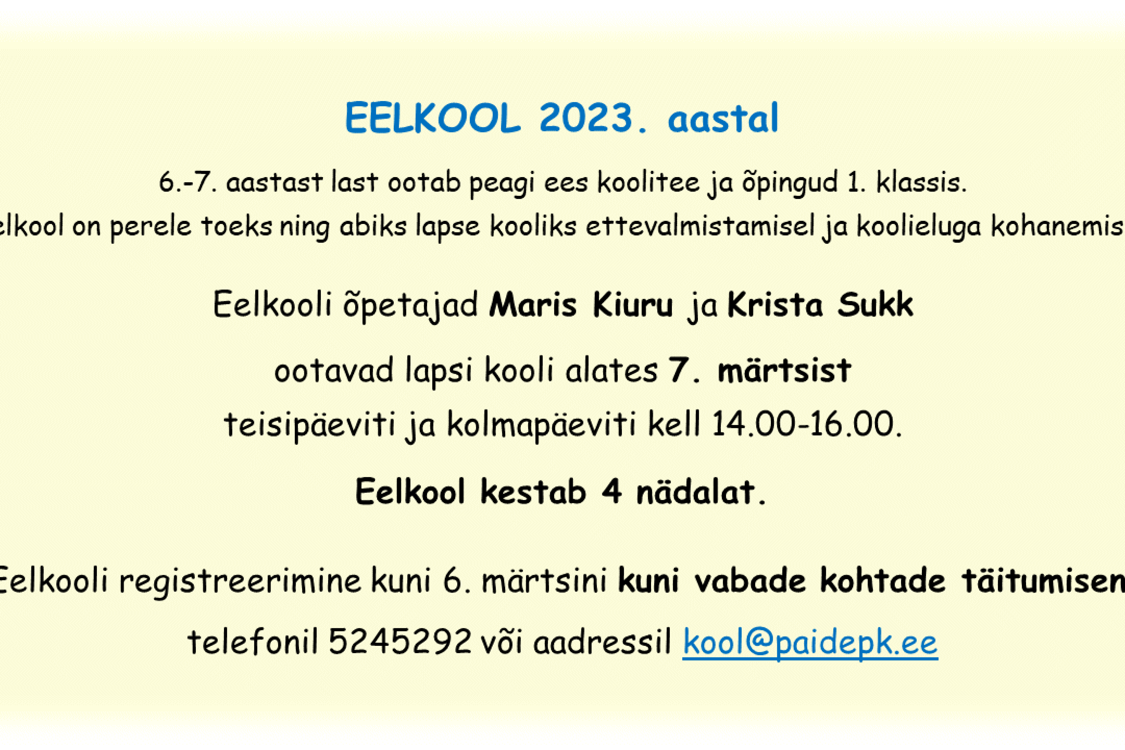 Ootame sügisel meie koolis kooliteed alustavaid lapsi eelkooli. Registreerimine kuni vabade kohtade täitumiseni!