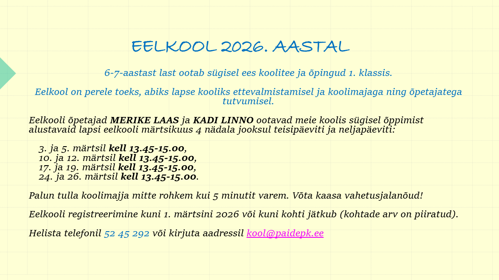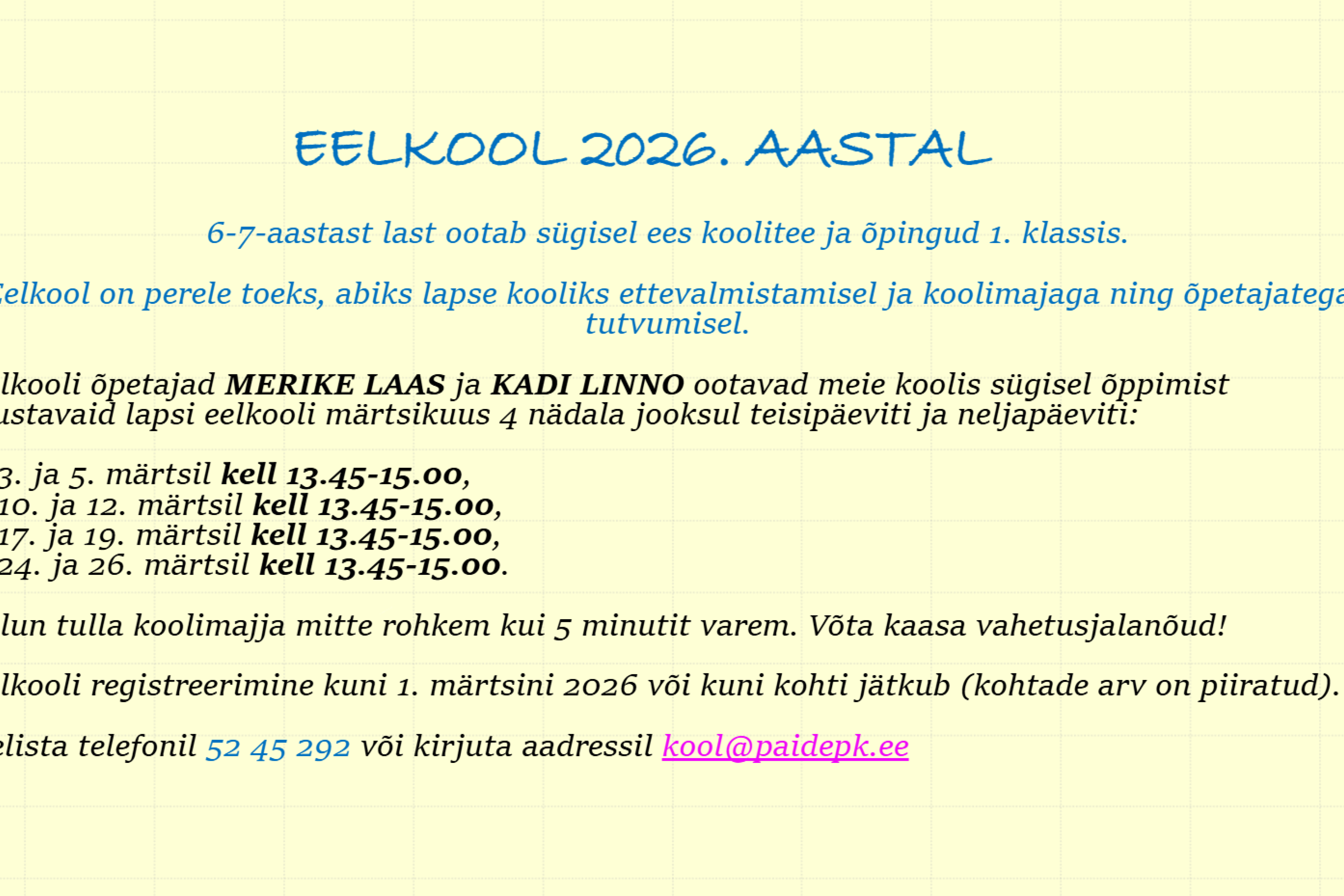 Kui soovid, et sinu laps osaleks eelkoolis, palun helista sekretärile telefonil 52 45 292 või kirjuta aadressil kool@paidepk.ee