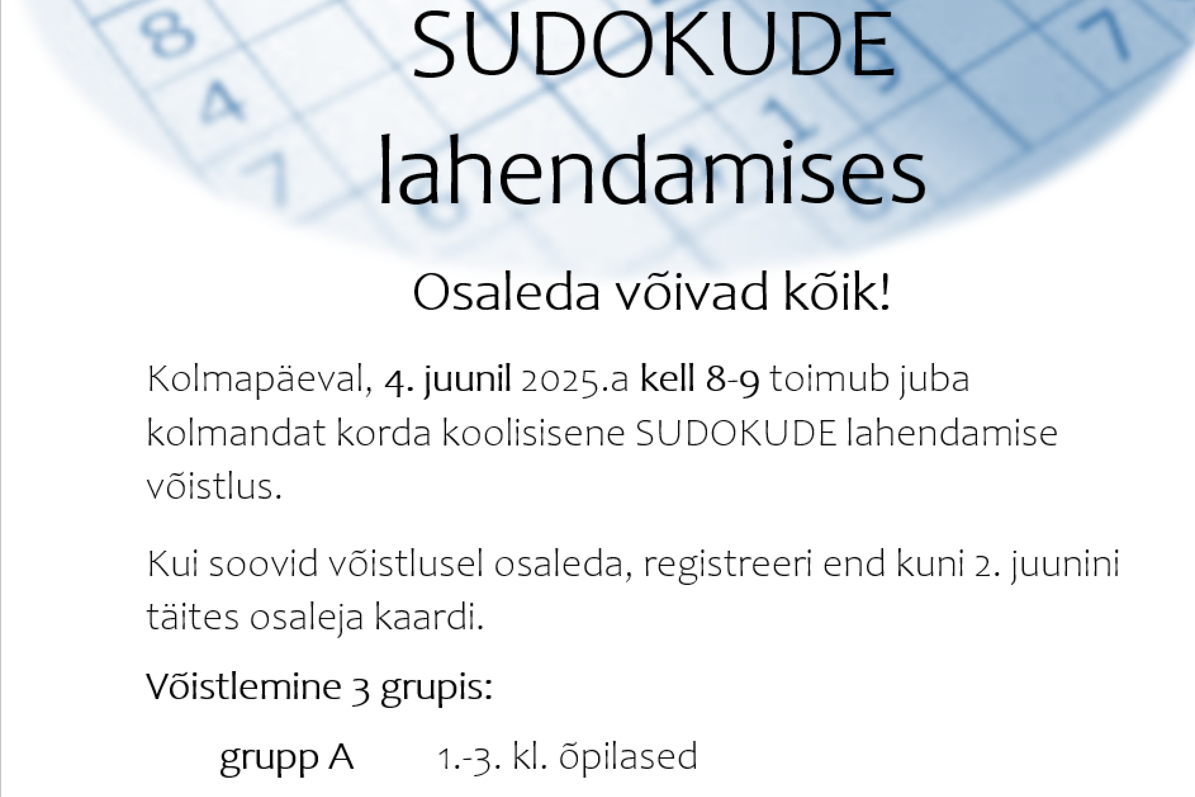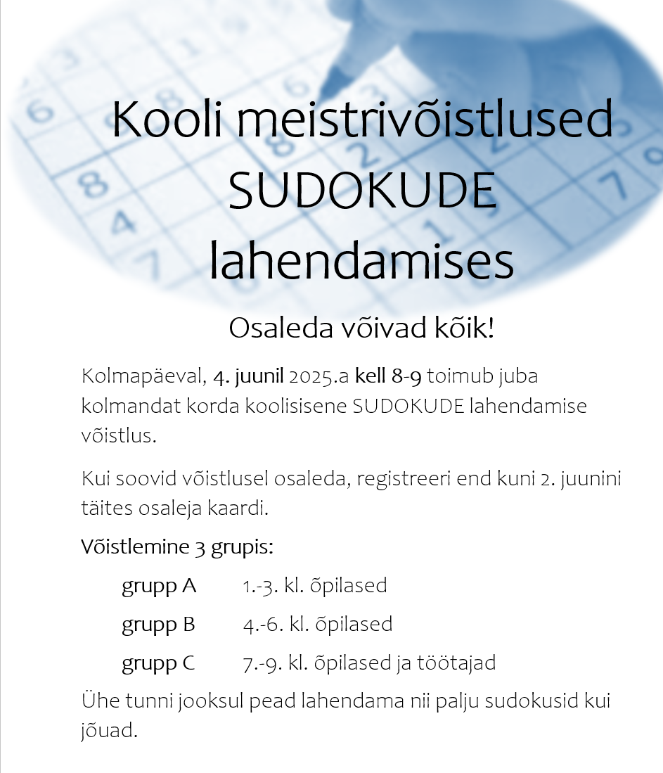 Kooli meister Sudokude lahendamises on teist aastat järjest 9.a klassi õpilane Carolin Kirs, kes jõudis 45 minutiga lahendada kõik võistlusülesanded ja kogus 668 punkti.